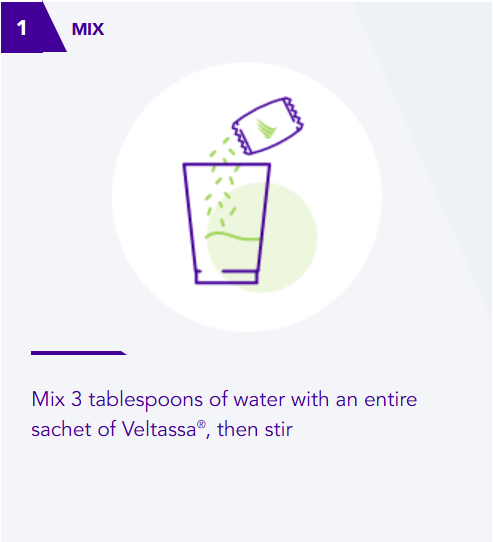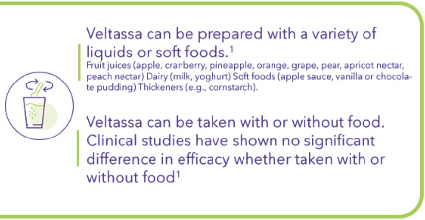 Veltassa can be administered with or without food. At least 3 hours should be left between taking Veltassa and any other medication. |