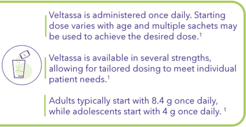 Veltassa (patiromer), 8,4 g och 16,8 g pulver till oral suspension, Rx, (F), Farmakoterapeutisk grupp: V03AE09, läkemedel för behandling av hyperkalemi och hyperfosfatemi. Indikation: Behandling av hyperkalemi hos vuxna och ungdomar i åldern 12–17 år. Kontraindikation: Överkänslighet mot den aktiva substansen eller mot något hjälpämne. Varning och försiktighet: Veltassa ska inte användas som ersättning för akut behandling av livshotande hyperkalemi. Serummagnesium bör övervakas under minst 1 månad efter påbörjad behandling och enligt klinisk indikation under behandlingen och magnesiumkomplettering övervägas hos patienter som utvecklar låga nivåer av serummagnesium. Nyttan och riskerna med administrering av patiromer bör utvärderas noga hos vuxna och pediatriska patienter med rådande eller tidigare allvarliga gastrointestinala besvär före och under behandlingen, samt hos vuxna och pediatriska patienter med risk för hyperkalcemi. Serumkalcium bör övervakas i minst 1 månad efter påbörjad behandling och enligt klinisk indikation under behandling. Serumkalium bör övervakas enligt standardpraxis när det är kliniskt indikerat, och efter att patiromer-dosen har titrerats eller avbrutits. Patienter bör instrueras att inte avbryta behandlingen utan att först rådgöra med läkare. Patienter med hereditär fruktosintolerans bör inte använda detta läkemedel. Patiromer kan binda vissa oralt samadministrerade läkemedel, vilket skulle kunna minska den gastrointestinala absorptionen av dem. Som förebyggande åtgärd ska administrering av patiromer separeras minst 3 timmar från andra orala läkemedel. Vanliga biverkningar: Hypomagnesemi, förstoppning, diarré, buksmärtor, illamående och gasbildning. Graviditet och Amning: Graviditet: Som en försiktighetsåtgärd bör man undvika användning av patiromer under graviditet. Amning: Beslutet om man ska avbryta amningen eller avbryta/avstå från behandlingen med patiromer måste fattas med hänsyn till fördelarna med amning för barnet och fördelarna med behandlingen för kvinnan. Förmån: Subventioneras endast för patienter med kronisk njursjukdom (CKD) i stadier 3–5, med eller utan kronisk hjärtsvikt, för vilka behandling med Resonium inte är lämpligt samt för patienter med kronisk hjärtsvikt utan samtidig kronisk njursjukdom. Baserad på produktresumé från 2024-06-06. För fullständig förskrivarinformation och priser se www.fass.se.